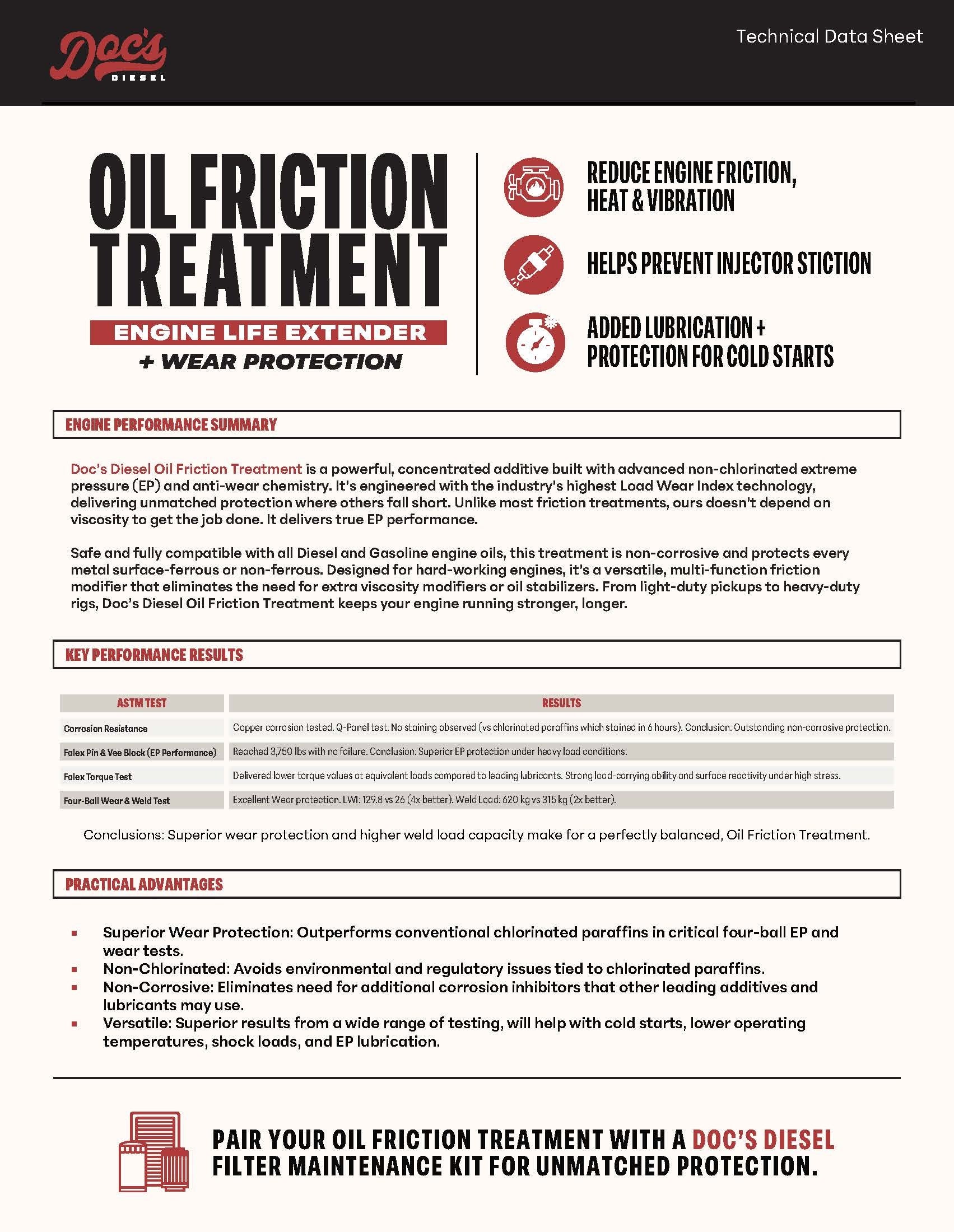 Doc’s Diesel Oil Friction Treatment boosts lubricity beyond standard oil, reducing friction, heat, and wear under the toughest conditions. It fights stiction, improves cold starts, and keeps engines cleaner for longer-lasting performance. Safe for diesel and gas engines, conventional or synthetic oils.
